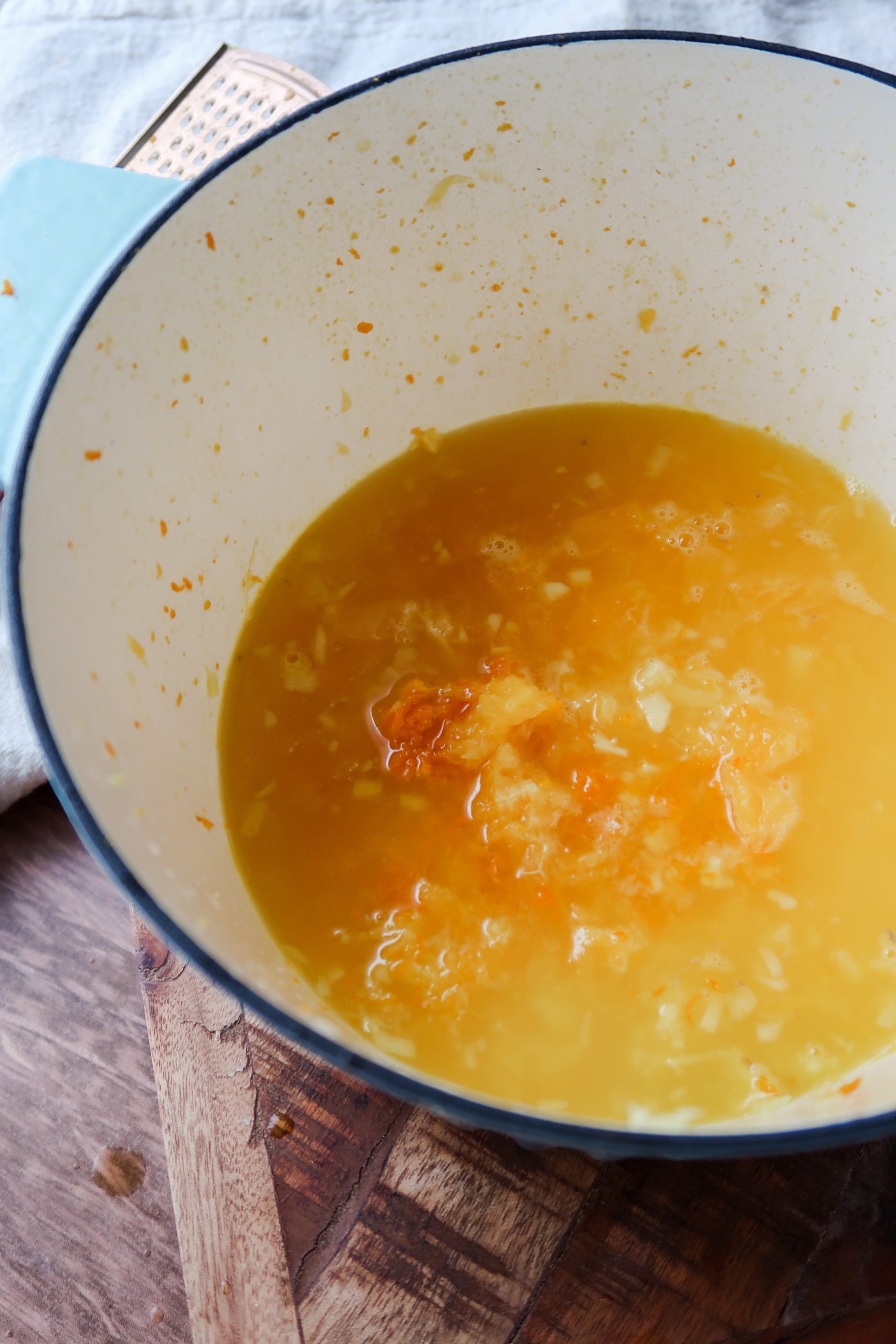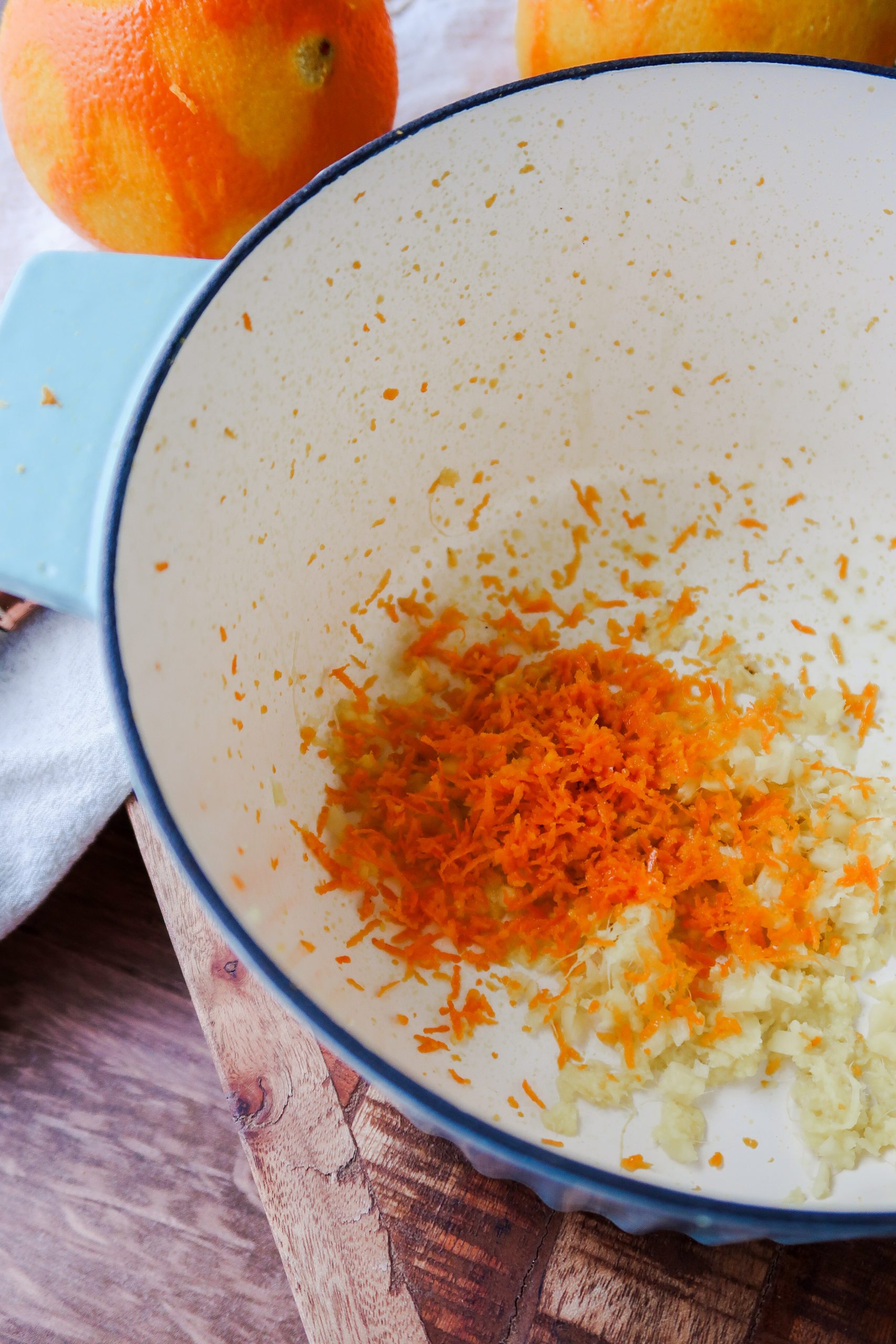 - To a medium-sized pot, add the minced ginger and the zest and juice of the oranges. Leave whatever pulp falls in for a delicious texture.4 teaspoon fresh minced ginger, the zest and freshly-squeezed juice of 2 Navel oranges