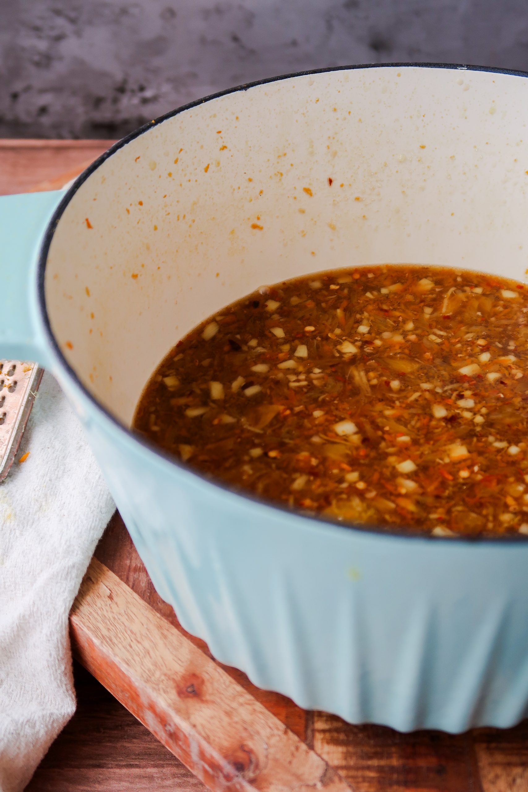 - Add all of the remaining ingredients (except for the cornstarch slurry) to the same pot. Don't judge the consistency of the sauce at this stage. All of the pieces will break down while simmering.